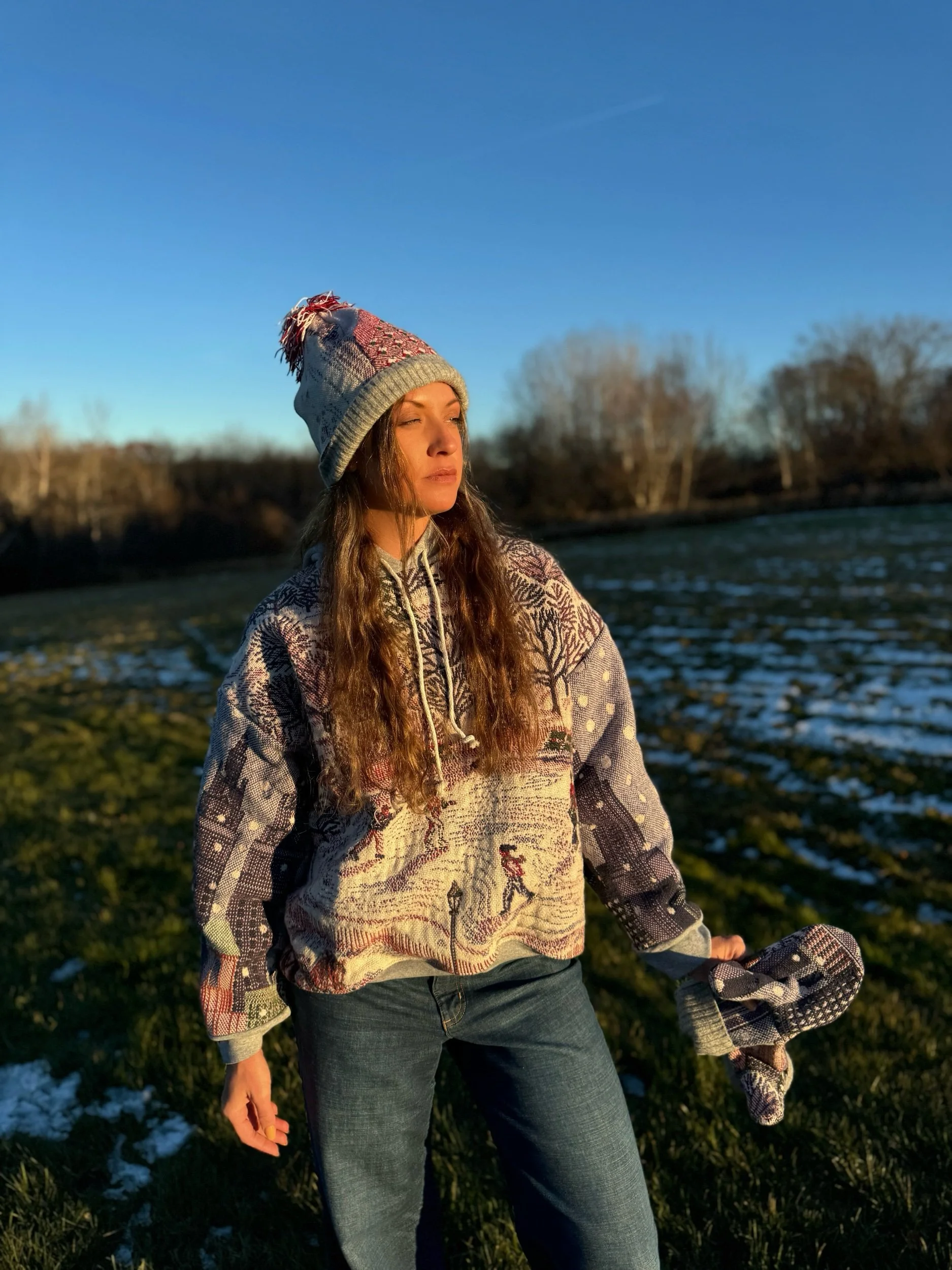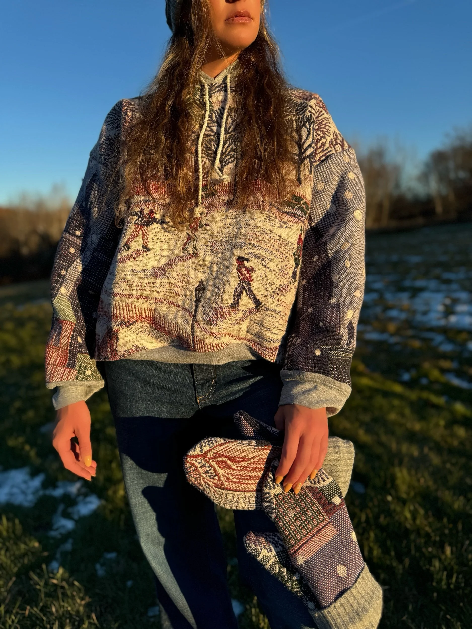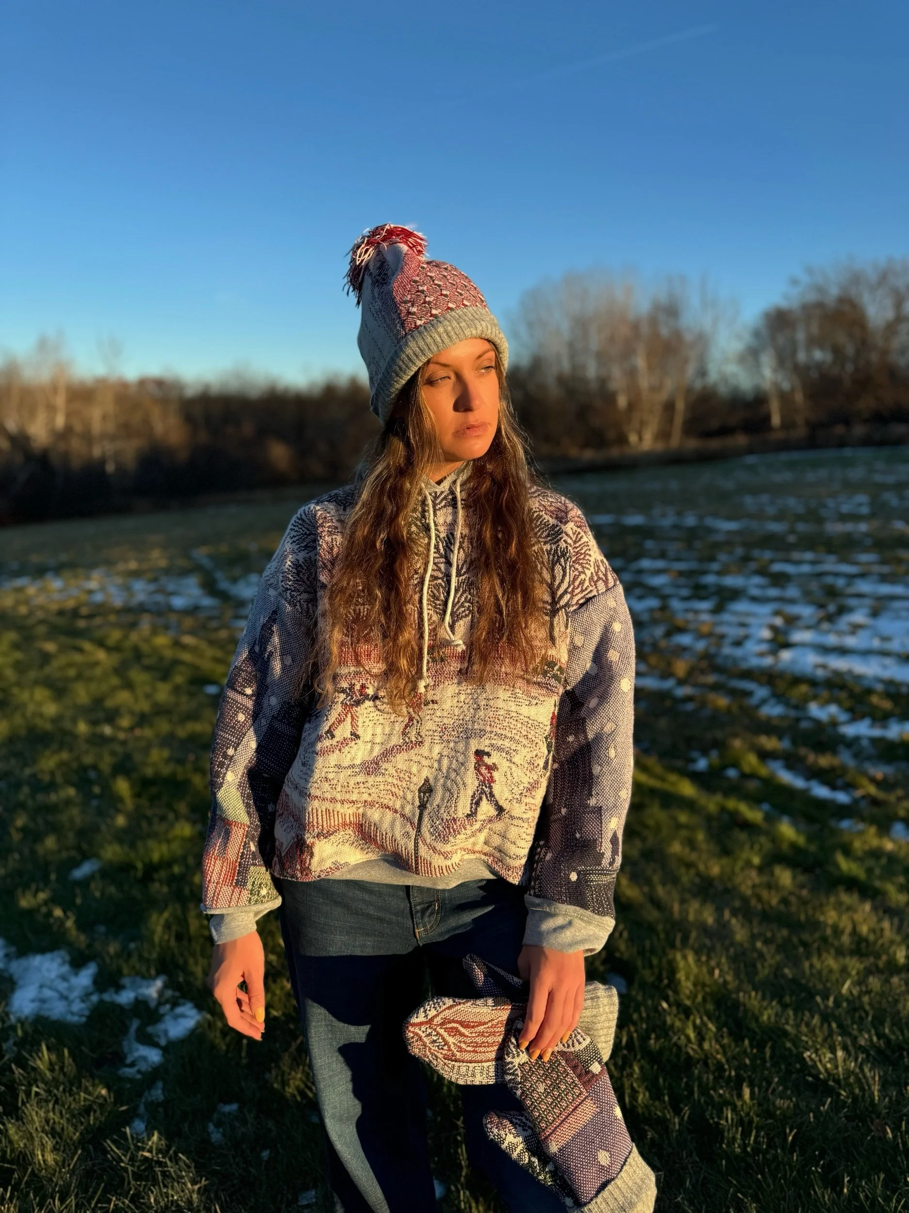 Hoodie made from an upcycled vintage holiday tapestry blanket featuring ice skaters, carriages, and a city skyline. Includes a matching pom style beanie and mittens