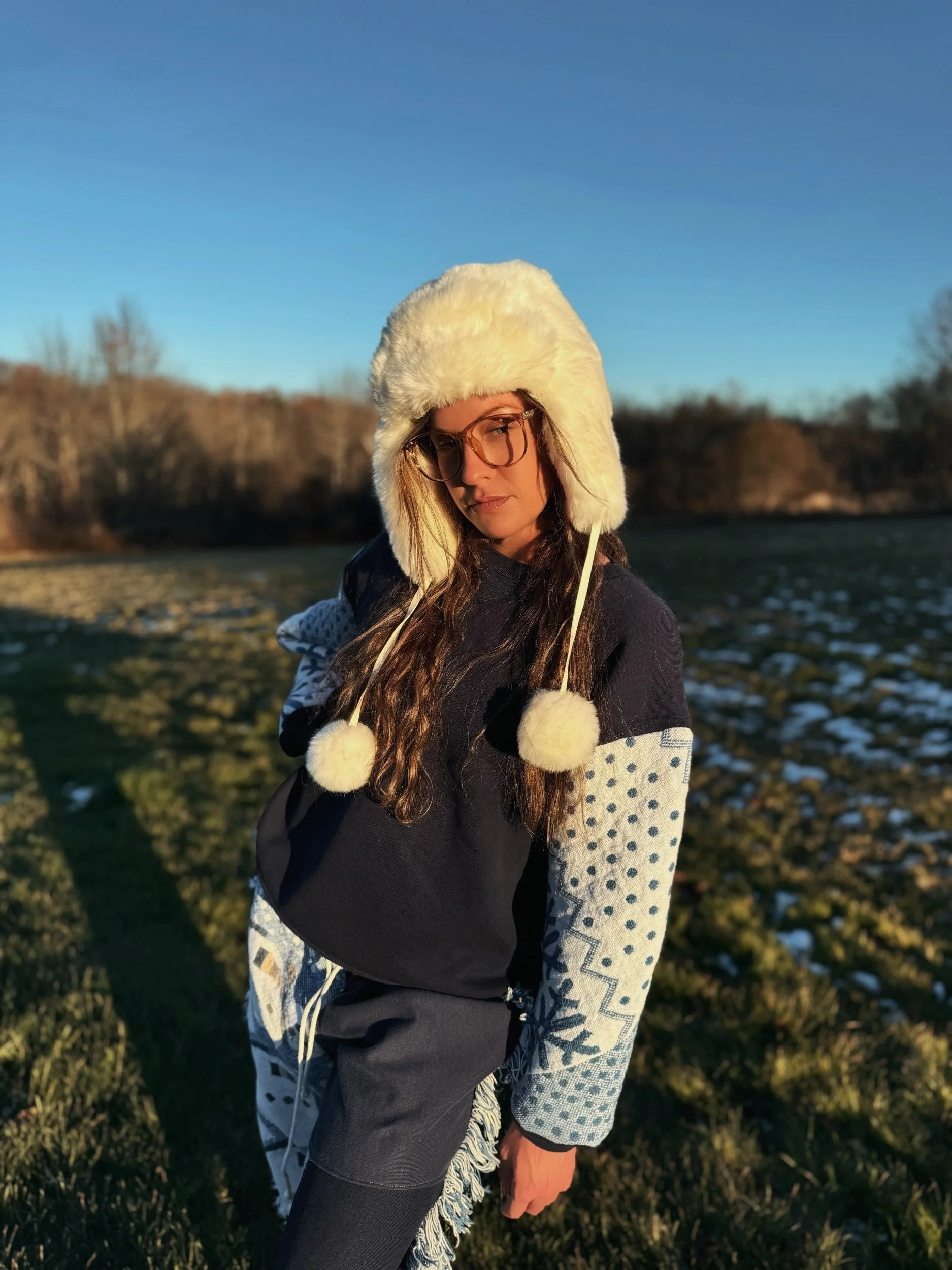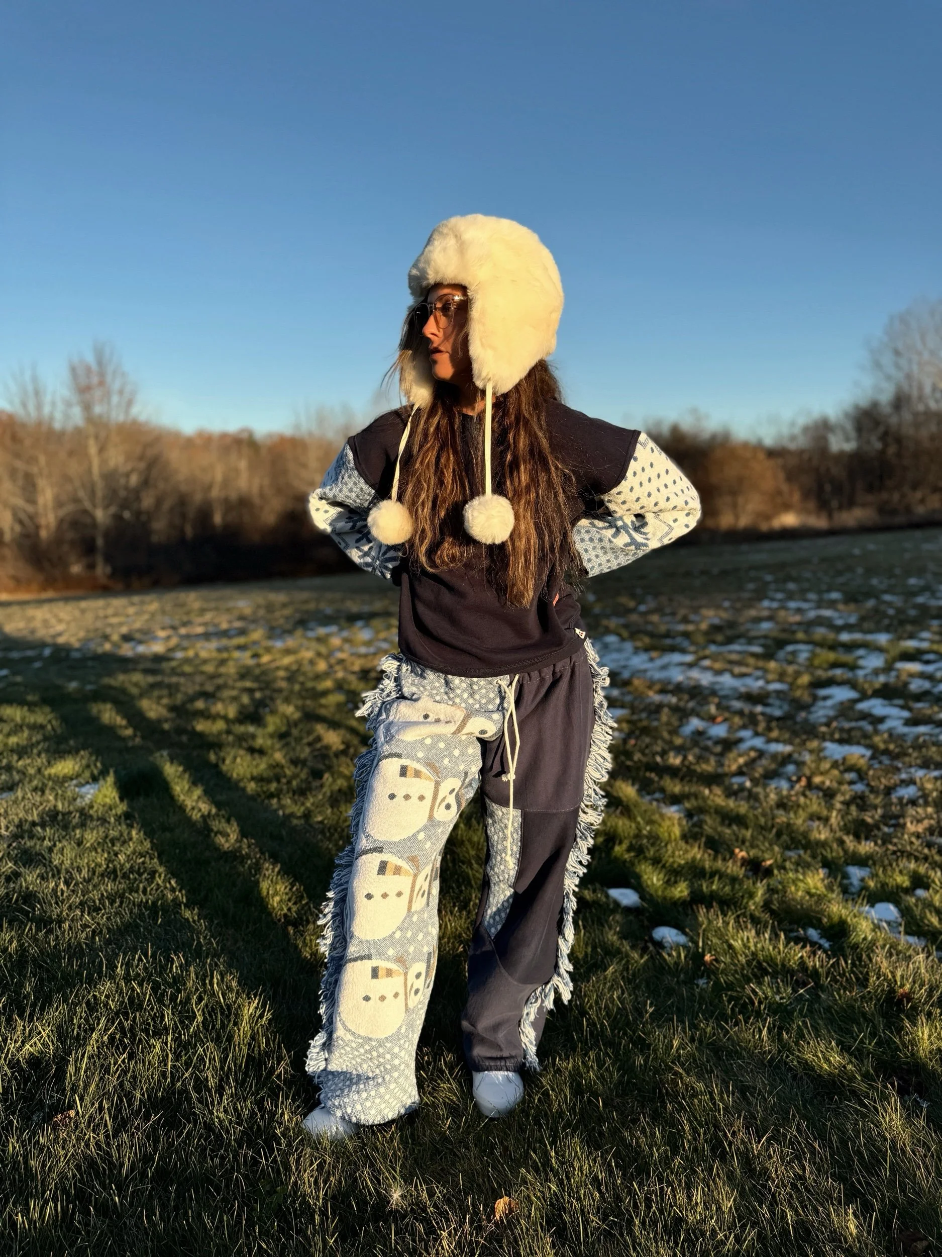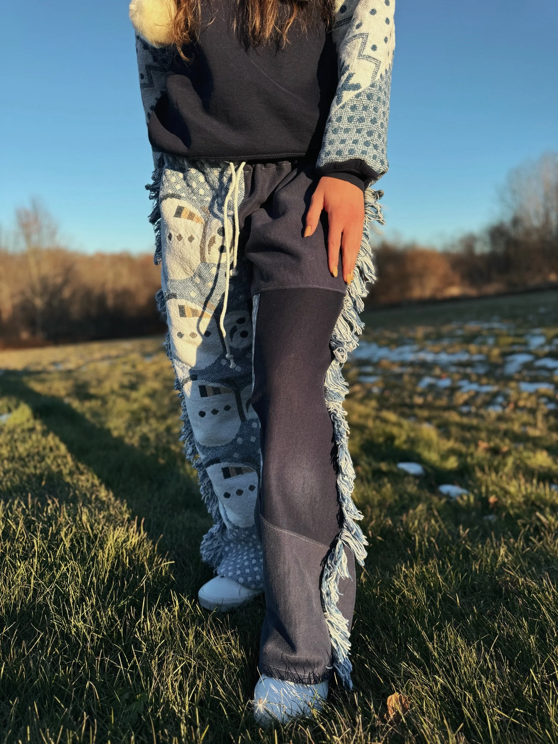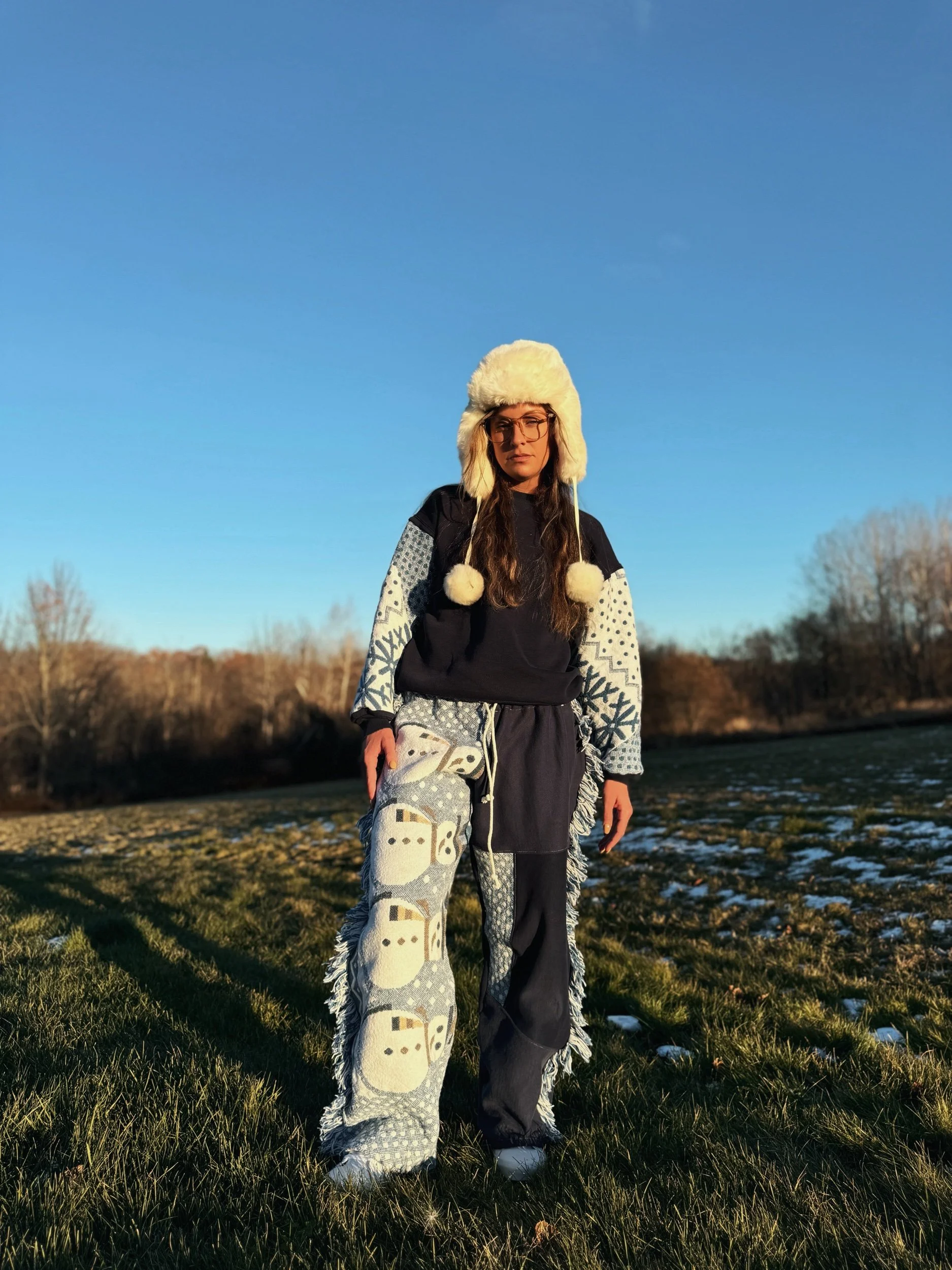 Crewneck and sweatpants made from an upcycled vintage crewneck and a holiday tapestry blanket featuring Snowmen and Snowflakes