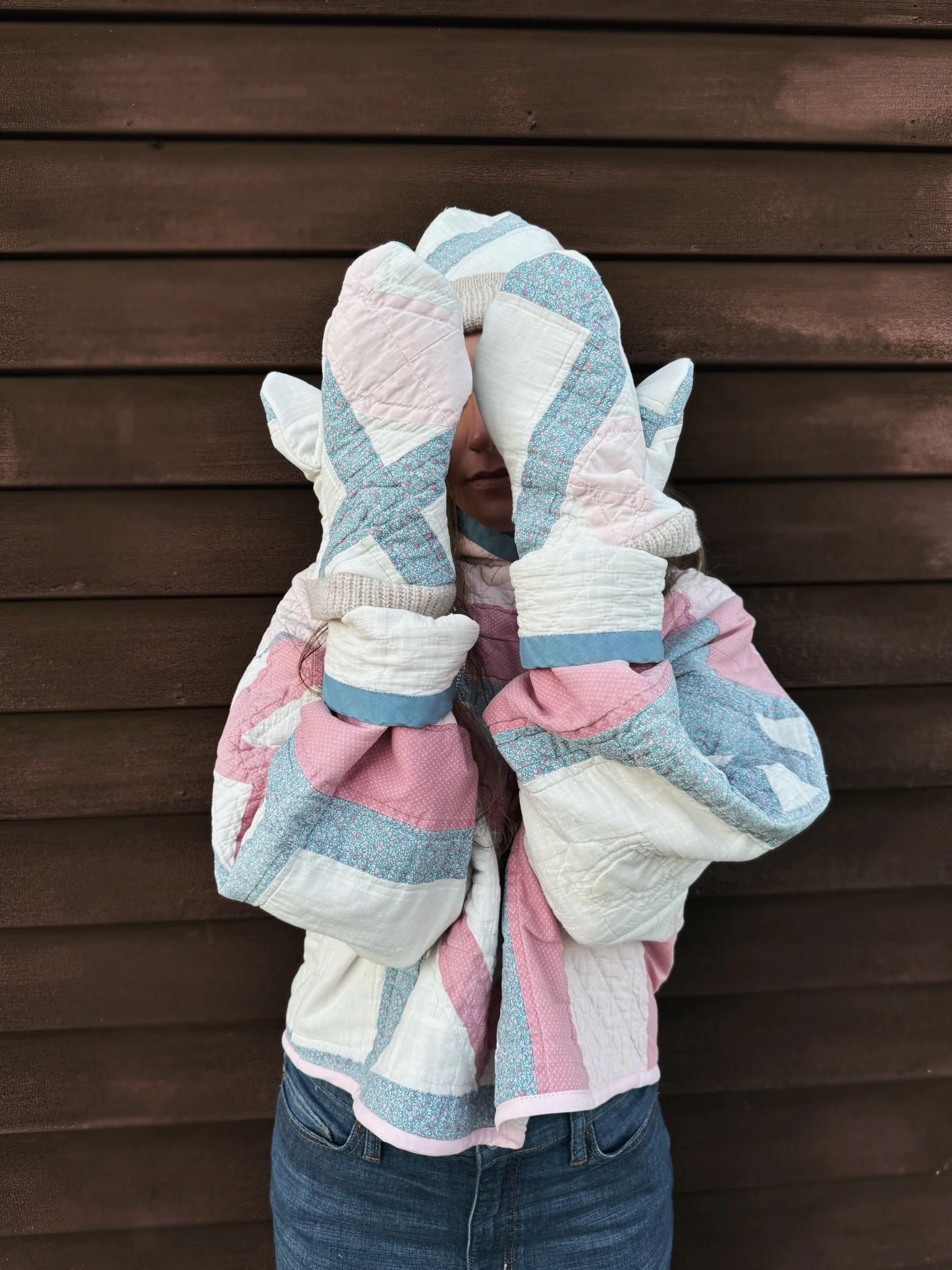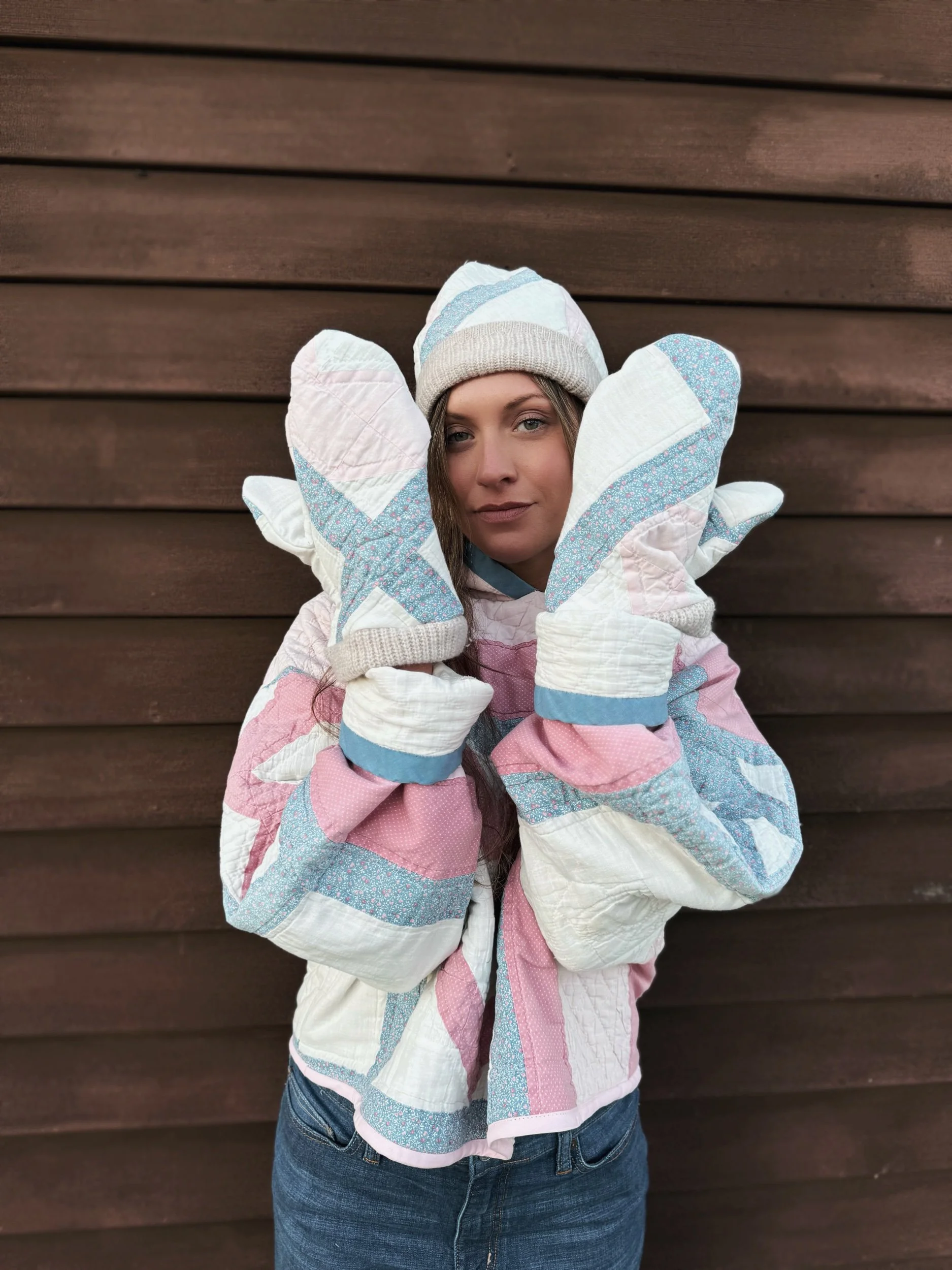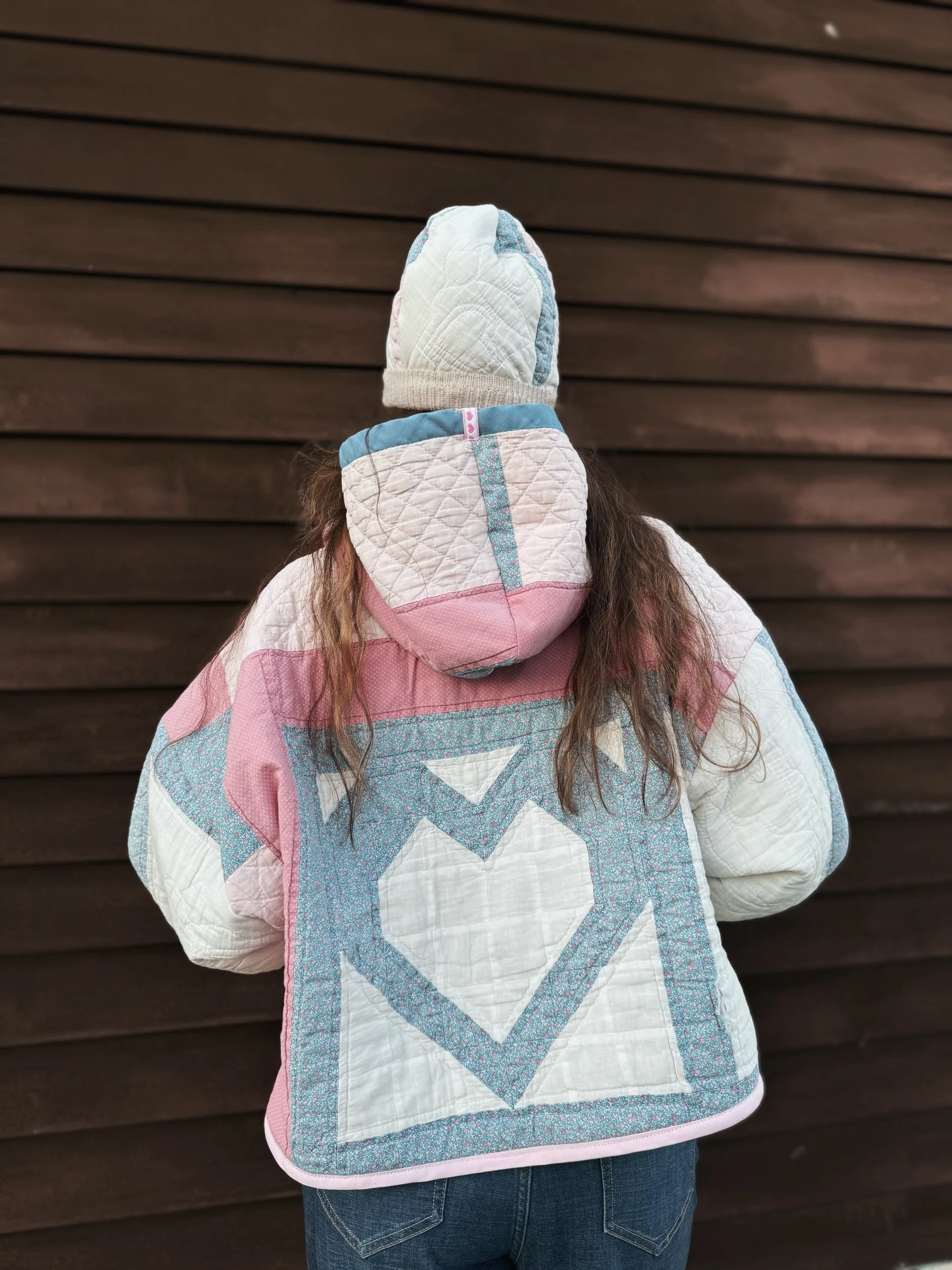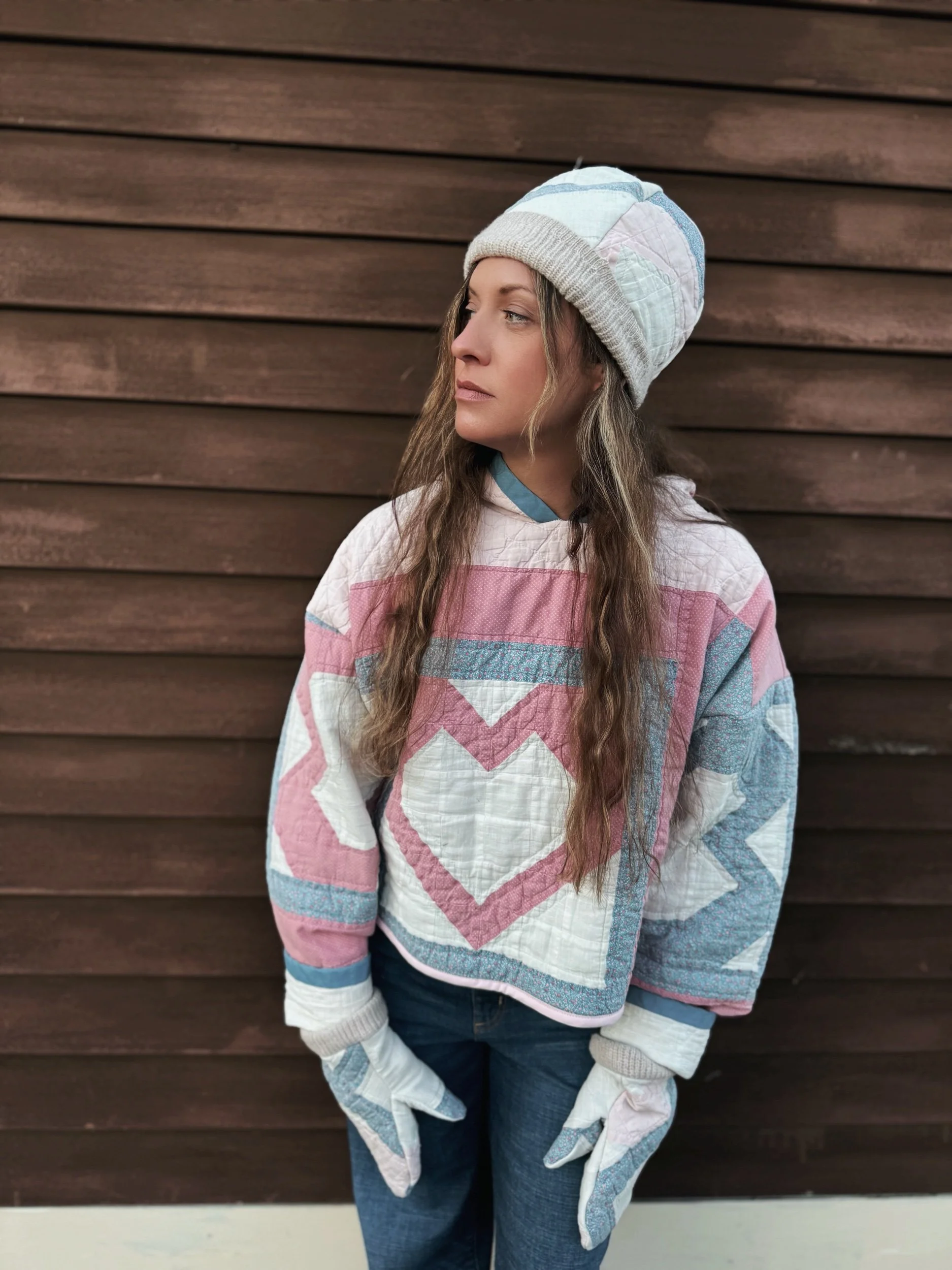 Hoodie made from an upcycled vintage quilt featuring heart imagery. Includes a matching beanie style hat and matching mittens. The quilt was locally sourced in Brunswick, ME and is extremely soft